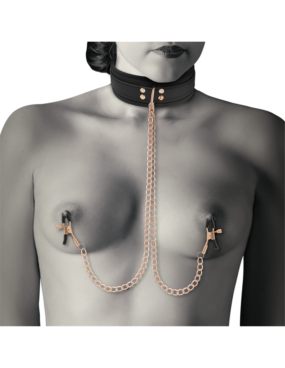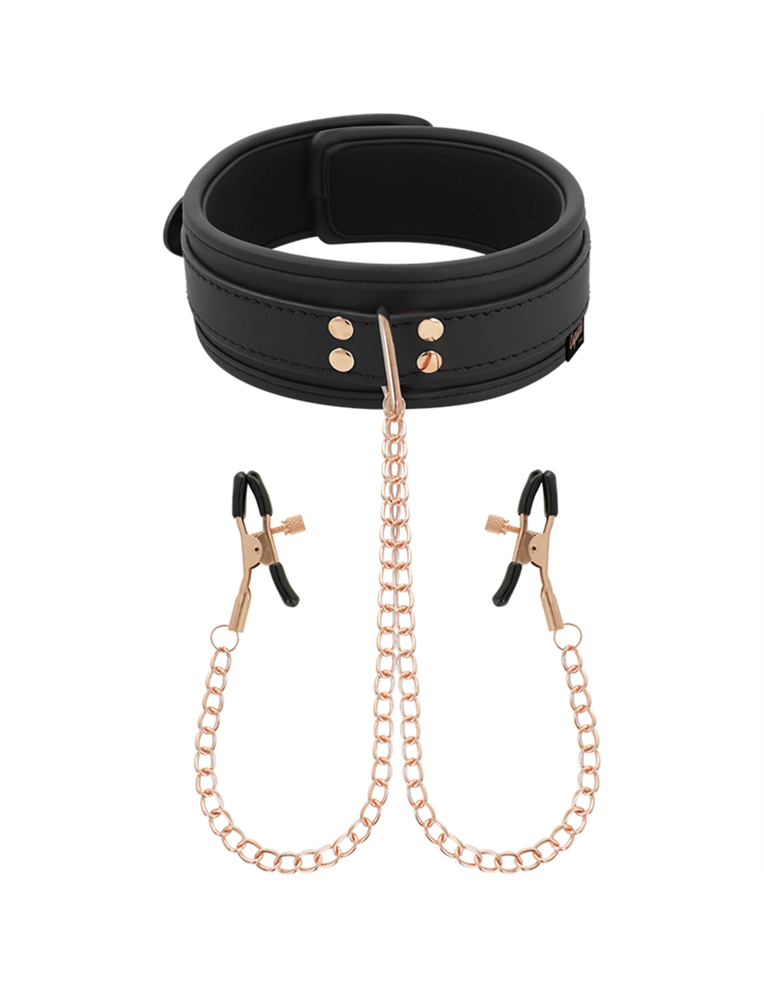 Fabricado de suave cuero vegano y acabado con dos pinzas para pezones con cadenas, este set de collar con pinzas te asegura a tu sujeto al momento.