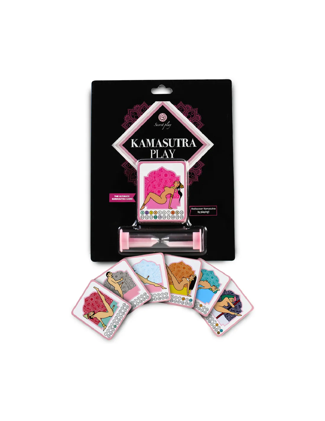 El juego contiene 40 cartas (20 de ellas son de hombre y 20 de mujer). Las cartas se dividen en dos montones y cada miembro de la pareja escoge uno de los montones de cartas, hombres o mujeres. Los dos jugadores van levantando las cartas a la vez, en orden. Si al levantar las dos cartas a la vez, por ejemplo en la carta de mujer hay un 8 coloreado y en la carta de hombre hay también un 8 coloreado, quiere decir que se ha encontrado la postura del Kamasutra!