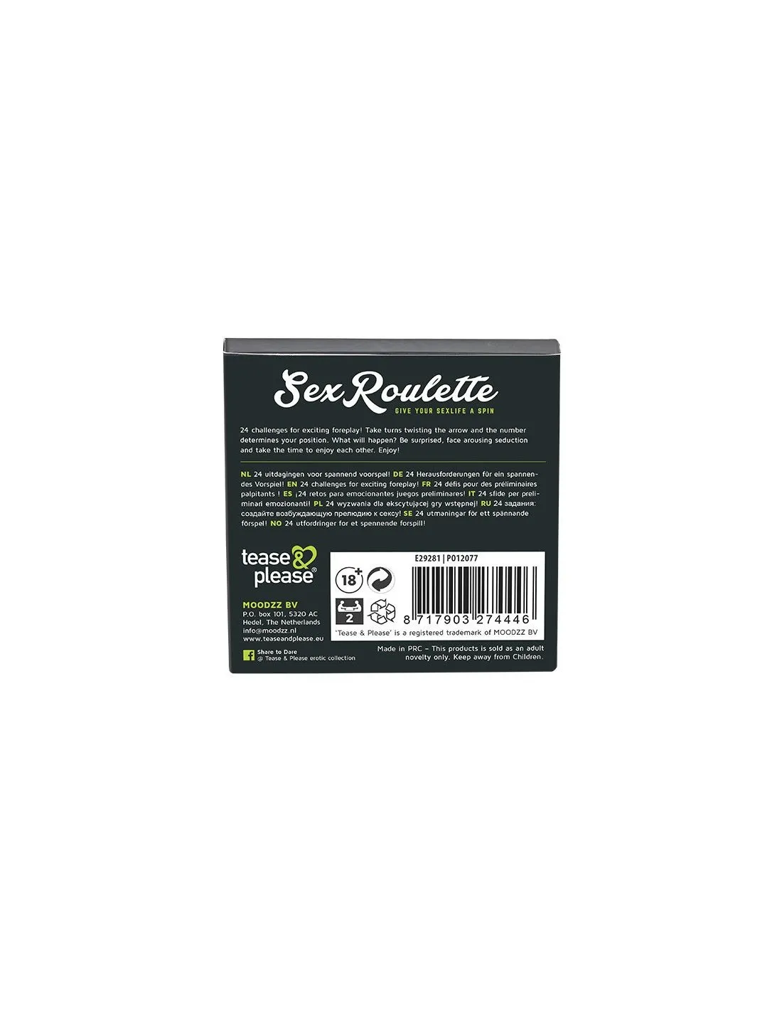 Sex Roulette es el último juego de Tease and Please. Vuelve a encender la emoción sensual en tu vida amorosa con solo un giro de la flecha de la tabla. La flecha apunta a un número que decide el desafío erótico íntimo que te espera.