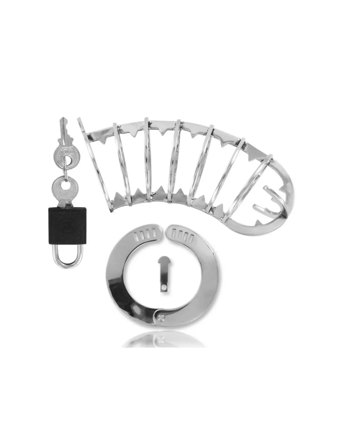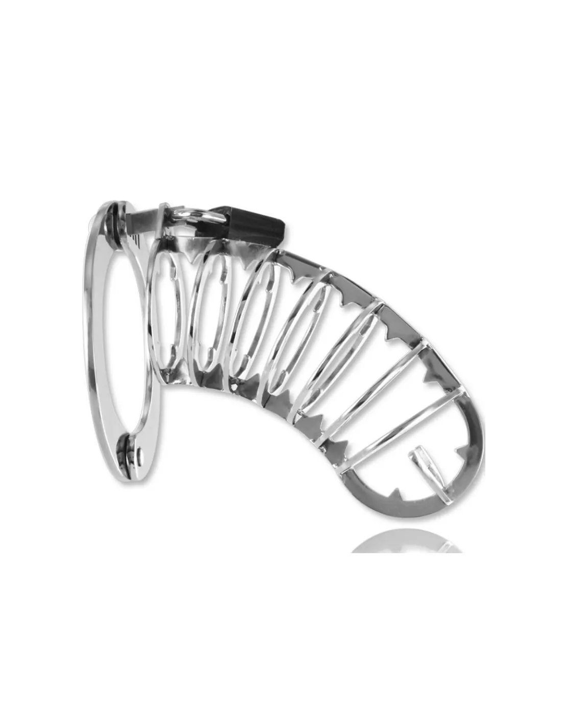 ¿Qué quiere conseguir un hombre que lo tiene todo? Esta jaula por supuesto. Este objeto tan versatil ofrece lo mejor de ambos mundos, es de acero inoxidable y es mucho más que una jaula de castidad. Está diseñada con siete anillos y con cuatro puntas en la zona del glande . El anillo incluido es ajustable estilo esposas gracias a su candado.