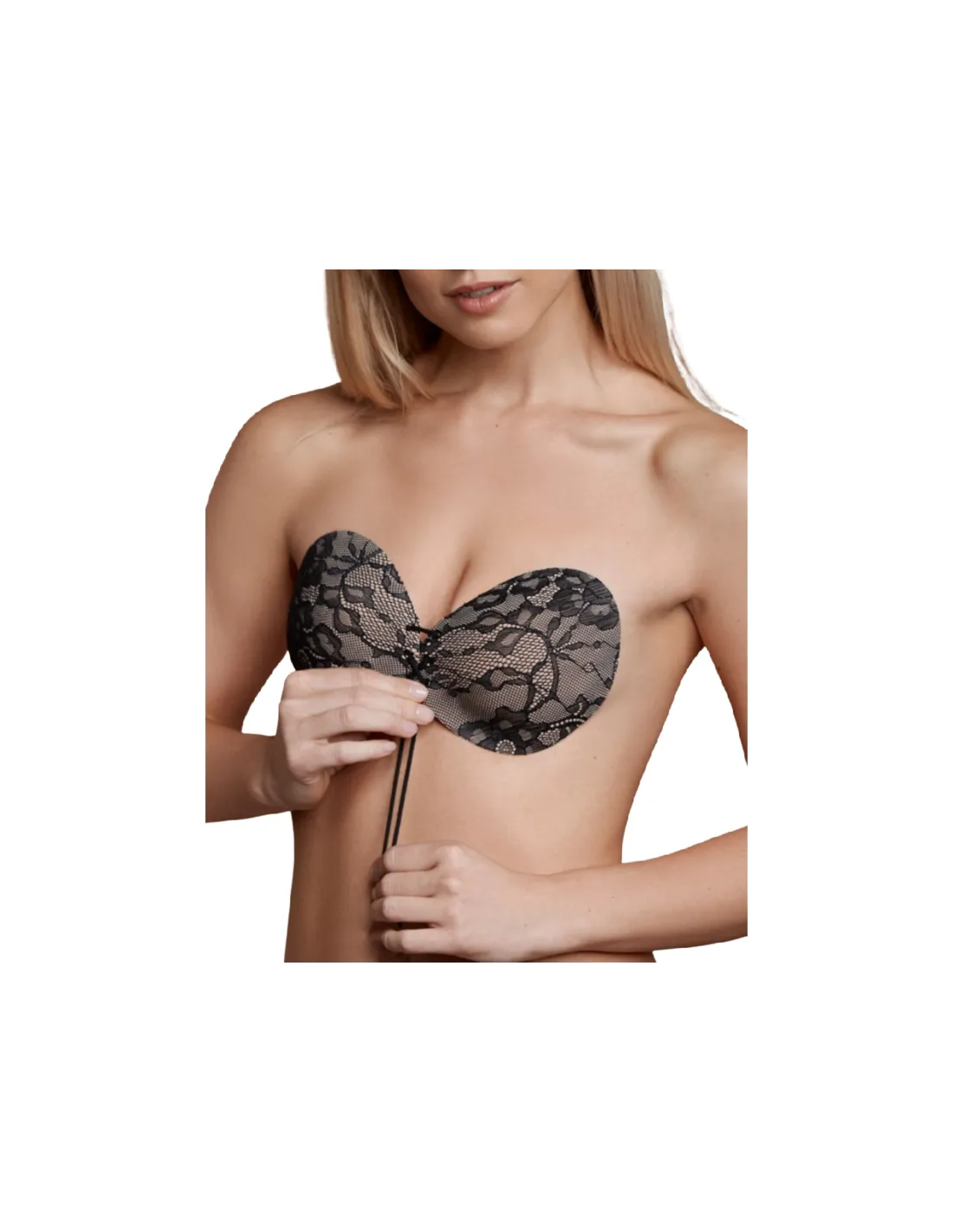 Despeja tu piel de cualquier aceite y crema. Una vez hecho esto, seque la piel con una toalla. Afloje el cierre frontal del sujetador de encaje redondo y retire la película protectora. Después, coloca las tazas en tus pechos. Presione suavemente las tazas adhesivas sobre la piel para suavizar y garantizar un soporte óptimo. Tire hacia abajo en ambos cordones juntos mientras desliza el cierre delantero hacia arriba.