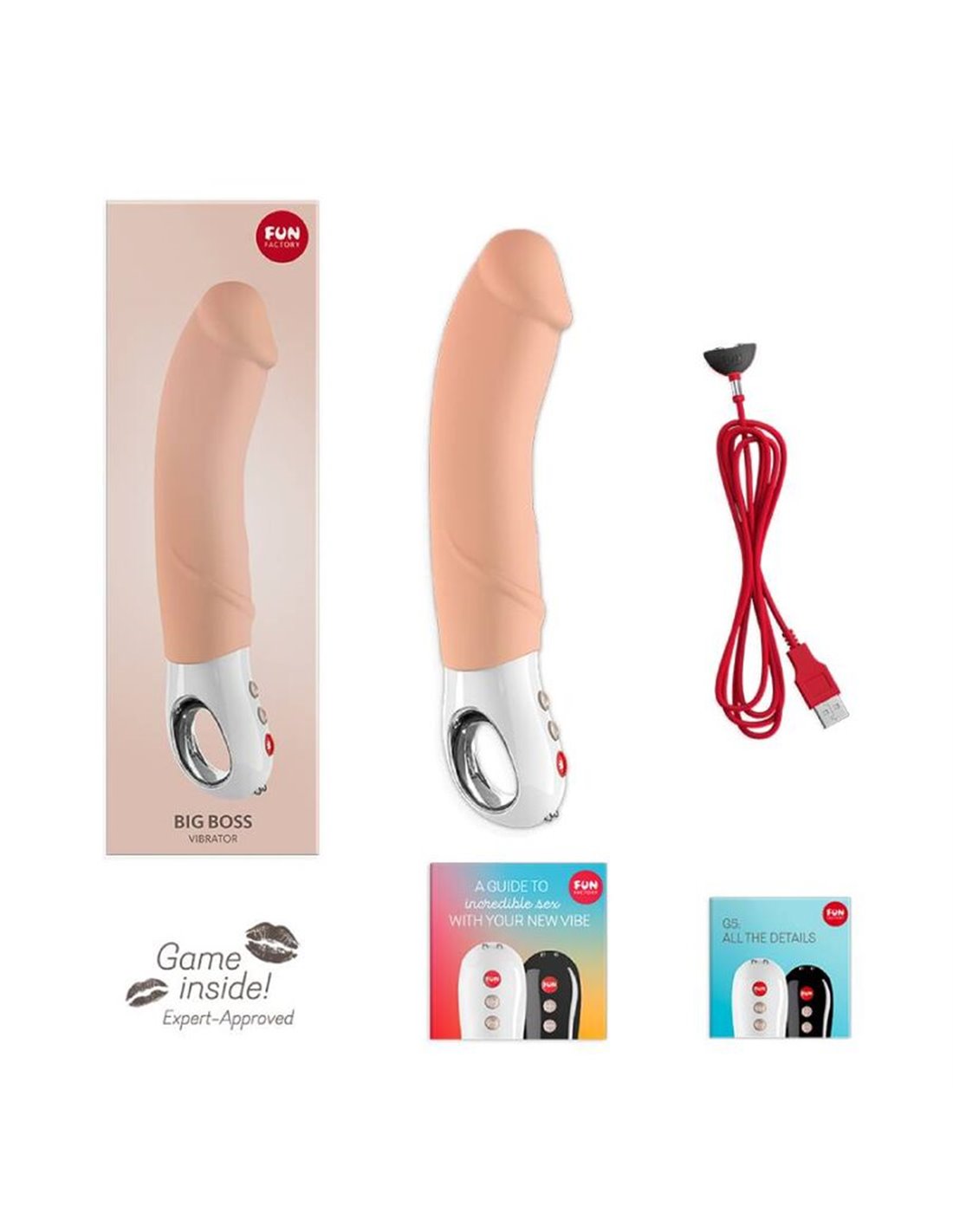 BIG BOSS es un vibrador para todos aquellos a los que les gusta lo grande. Especialmente las mujeres seguras de sí mismas y las parejas que saben lo que quieren y les gusta el placer intenso encontrarán un verdadero sparring en el cuadrilátero con BIG BOSS. Un hombre experimentado debería ser capaz de reconocer las atractivas cualidades del vibrador más grande de FUN FACTORY. Armados con BIG BOSS, juntos pueden hacer que cualquier mujer pierda la cabeza con éxtasis. BIG BOSS cumple sus promesas y garantiza potentes juegos de poder bajo las sábanas.
