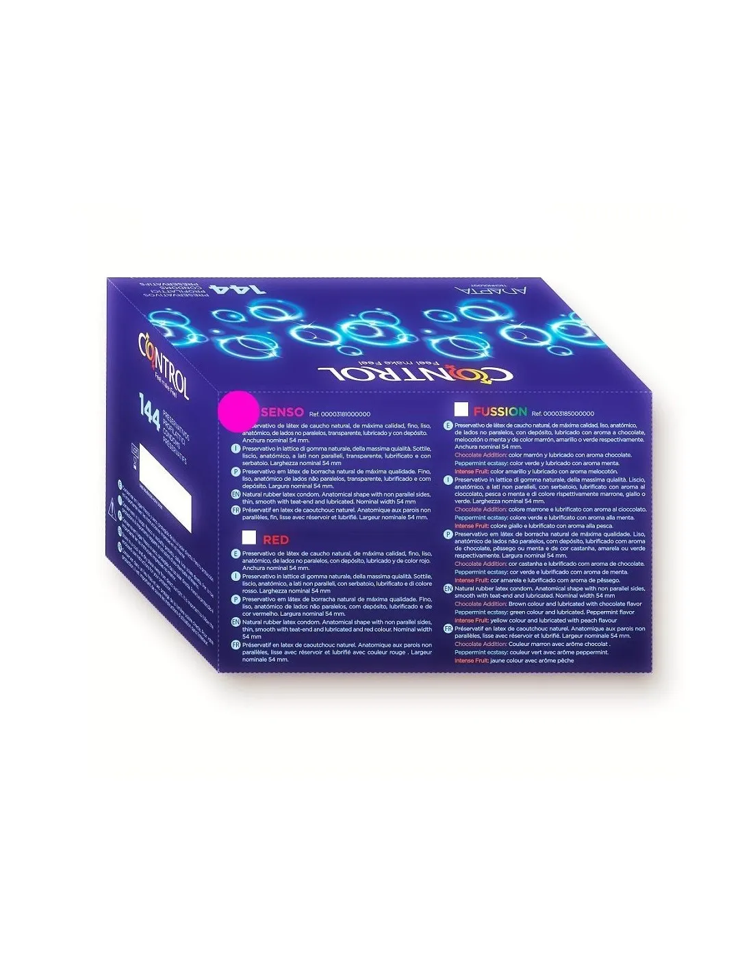 Control Adapta Senso es un preservativo en látex de caucho natural de máxima calidad, fino, liso, anatómico, de lados no paralelos, transparente, lubricado y con depósito